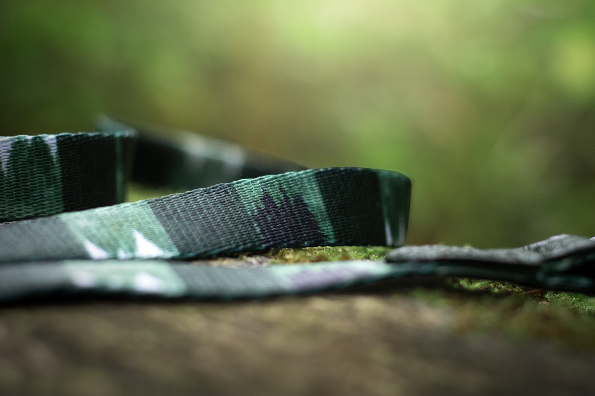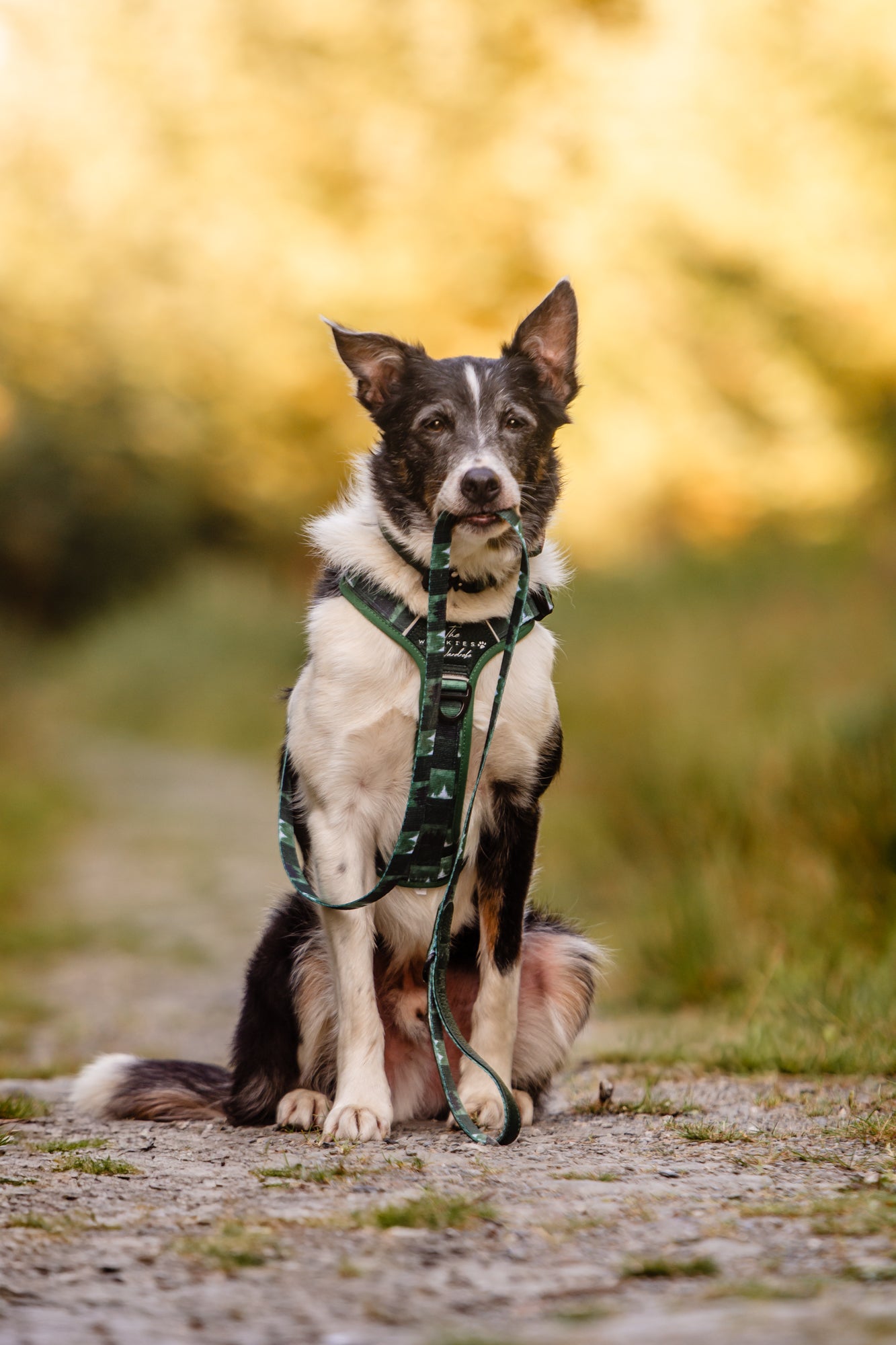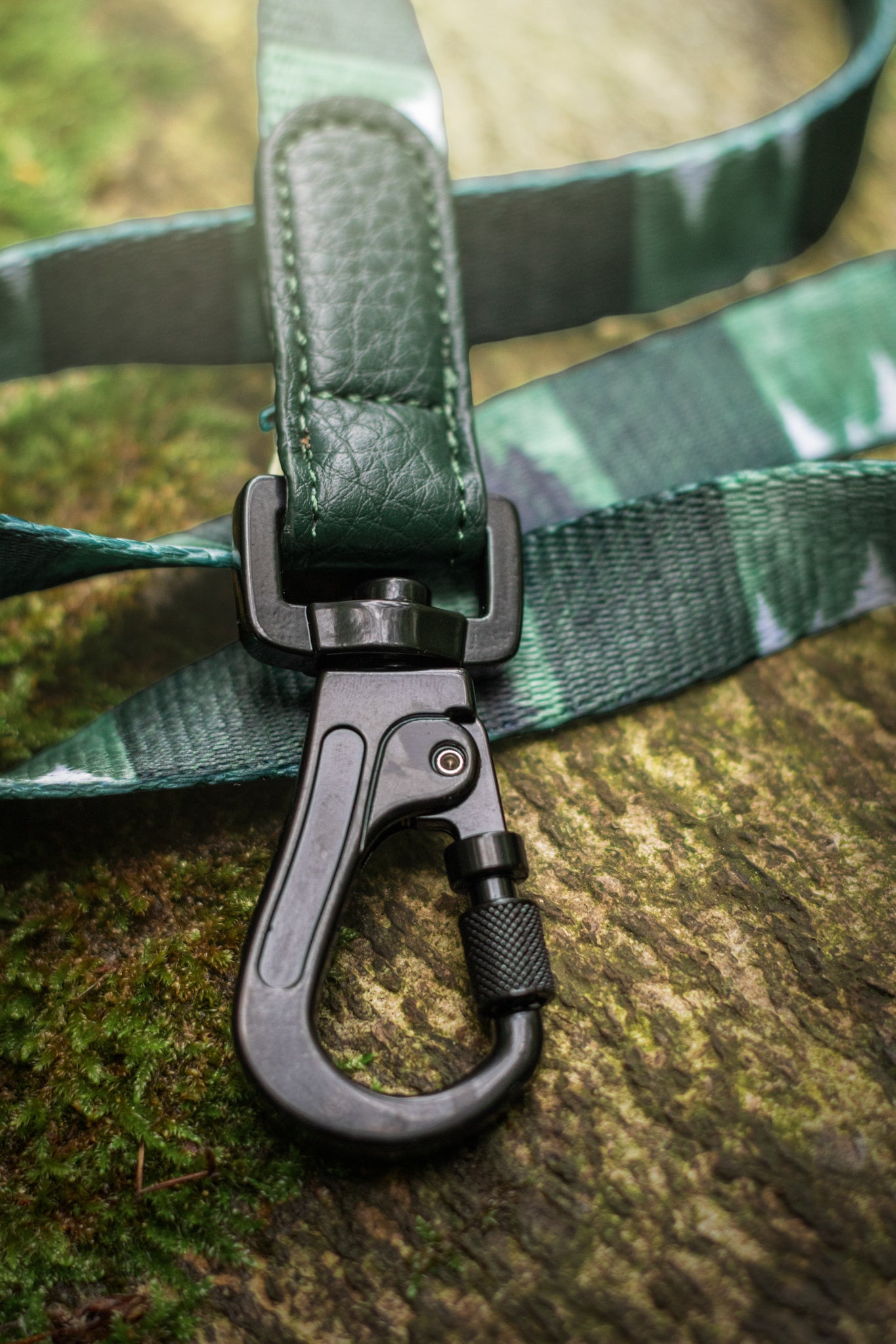 A luxurious double sided printed leash with a new padded faux leather comfort handle, sleek black metal hardware, and subtle white logo detailing.