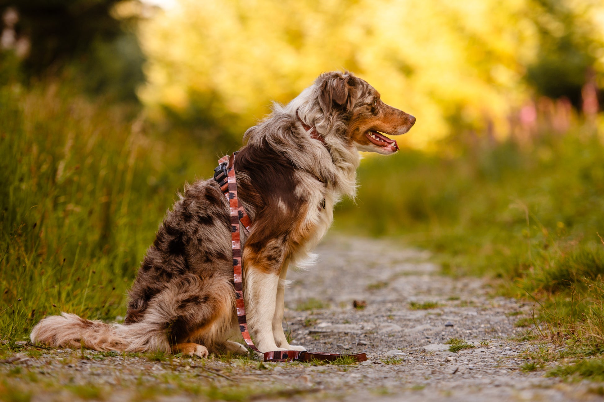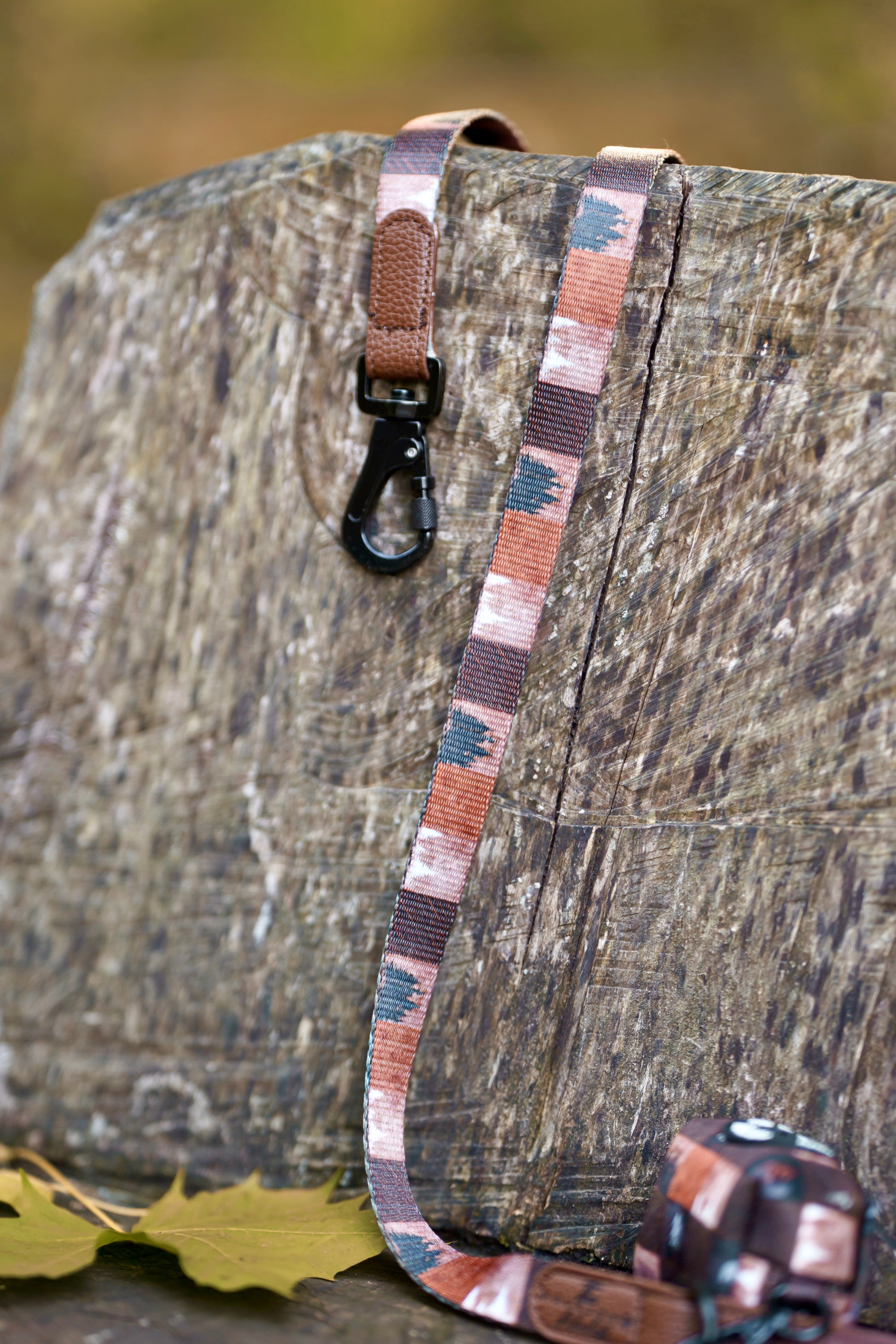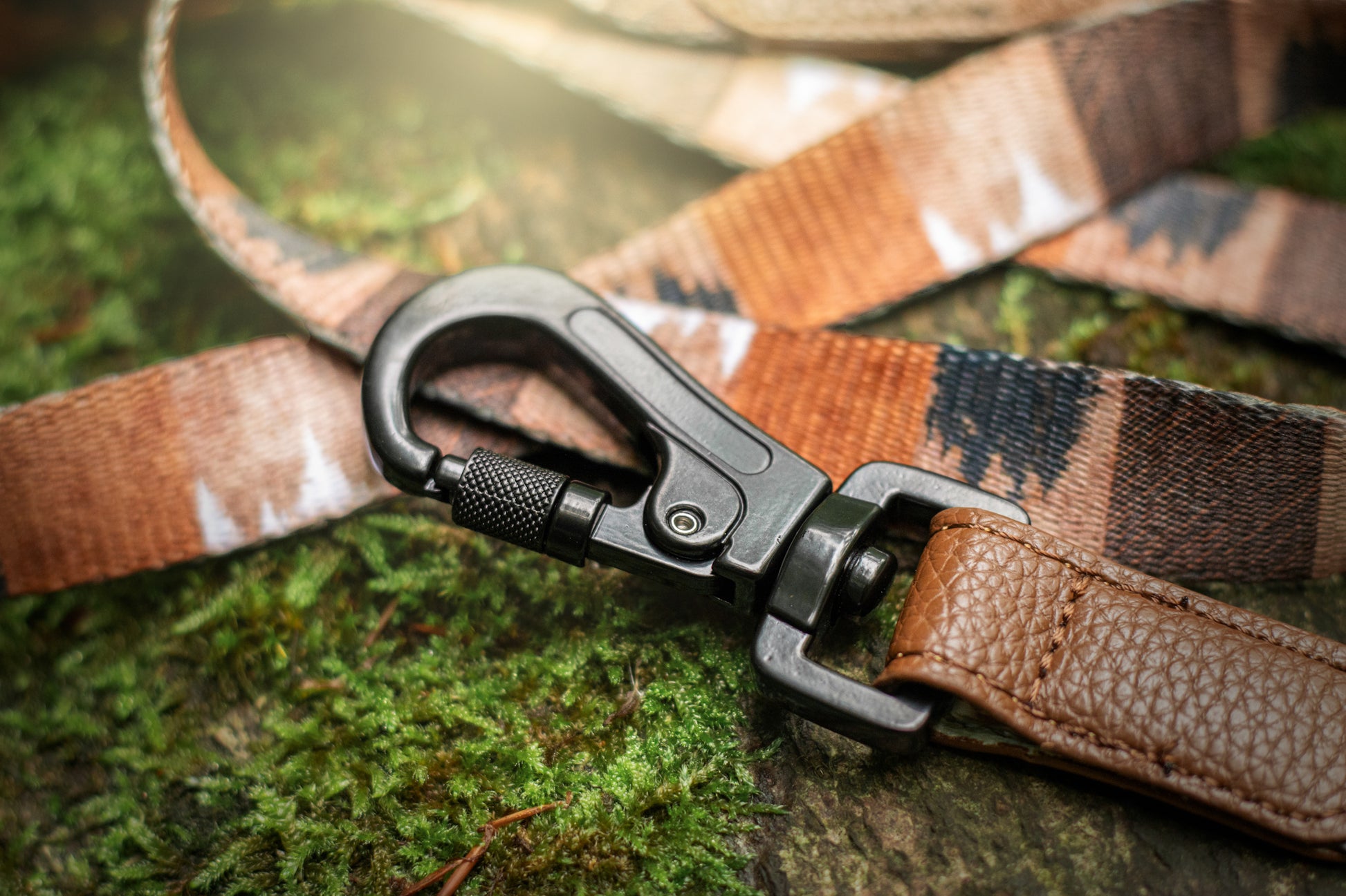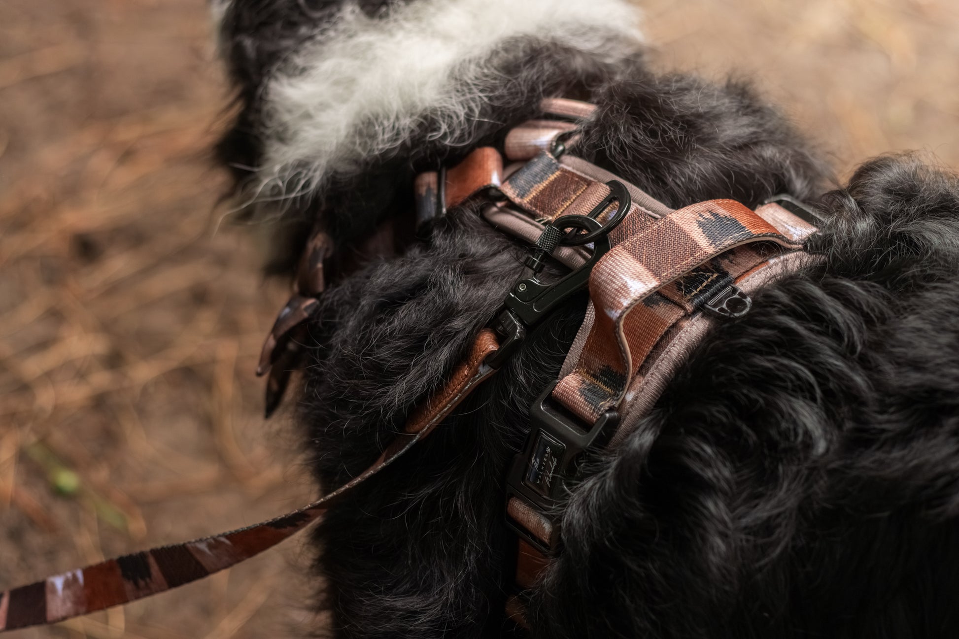 A luxurious double sided printed leash with a new padded faux leather comfort handle, sleek black metal hardware, and subtle white logo detailing.
